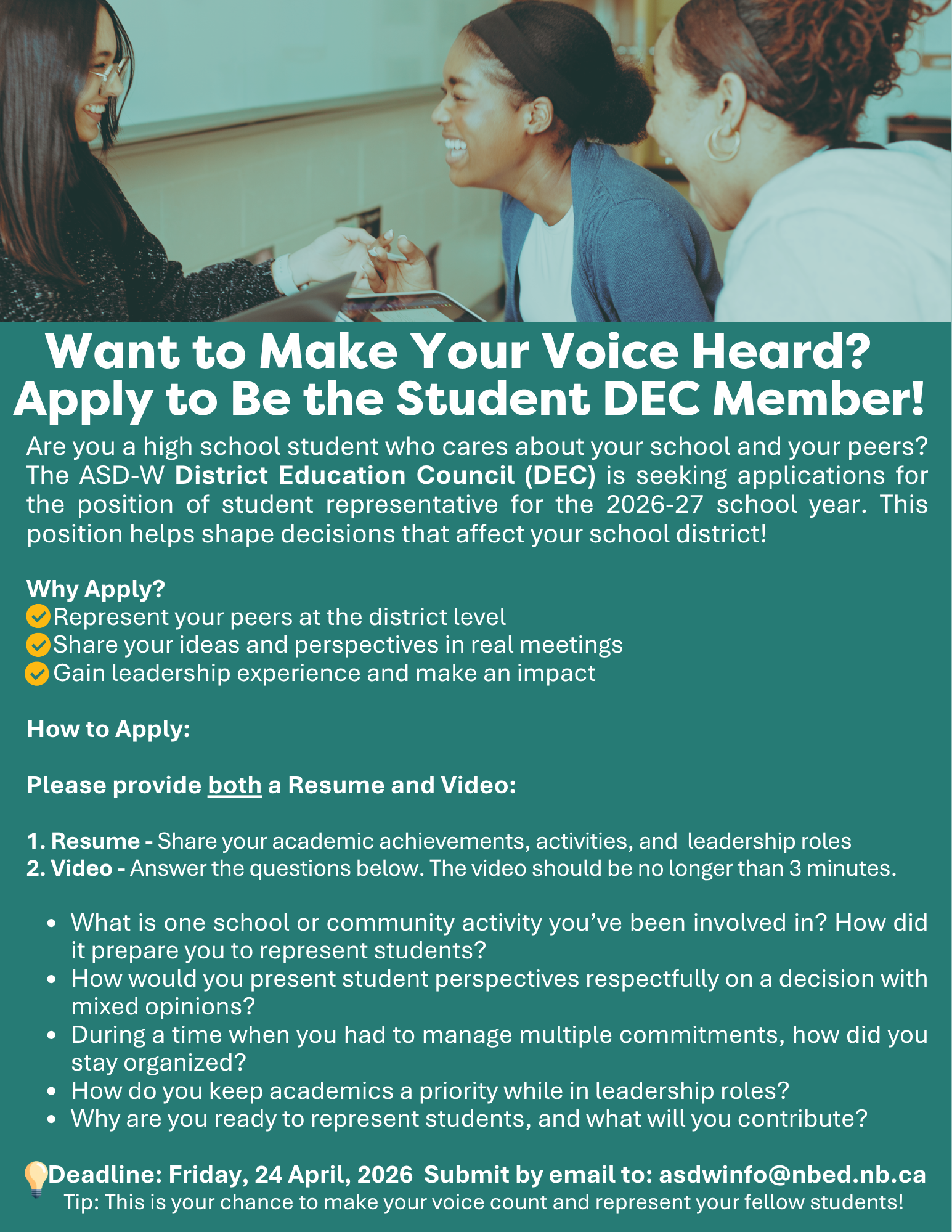 The District Education Council is looking for a student representative for the 2026-2027 school year. Applications are now open. Click for more details.