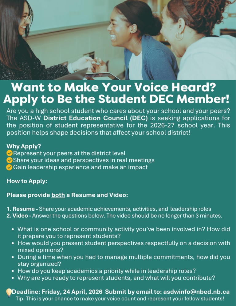The District Education Council is looking for a student representative for the 2026-2027 school year. Applications are now open. Click for more details.